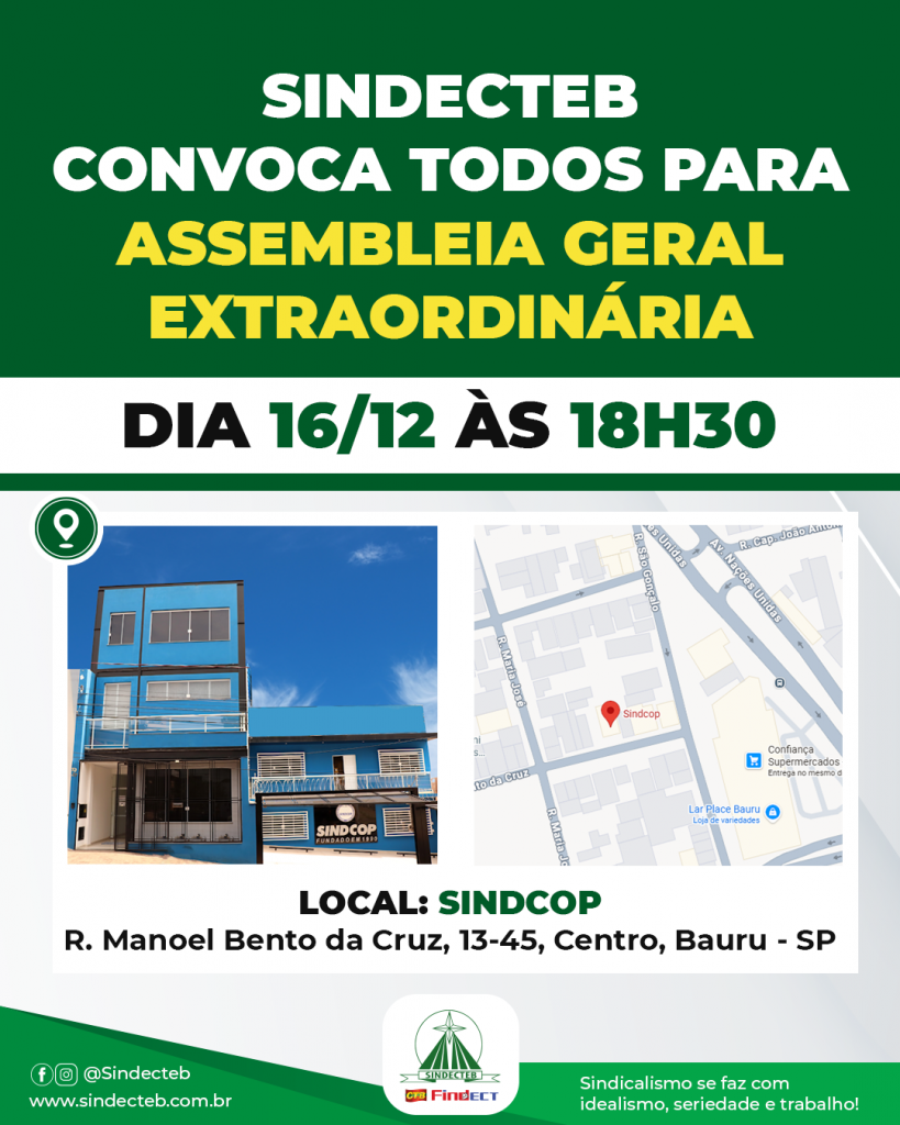 O SINDECTEB convoca todas as trabalhadoras e todos os trabalhadores da sua base territorial para a Assembleia Geral Extraordinária que será realizada no dia 16 de dezembro de 2025. A assembleia ocorrerá no auditório do SINDICOP, localizado na Rua Manoel Bento Cruz, 13-45, Centro, Bauru/SP, às 18h30 em primeira convocação e às 19h00 em segunda e última chamada.